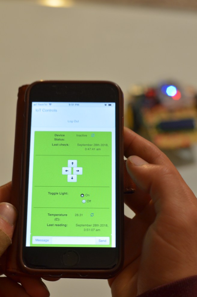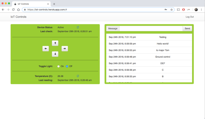 This was my first full-stack IoT project. I wanted to create something that had two-way communication between a user on a web application and a ‘thing’. I built and wired up a small motorized car with a NodeMCU chip (like an Arduino, but WiFi-capable), motorized wheels, a blinking light, a thermometer, and an LCD display. I also spun up a simple web application from which to control and monitor the car. I established communication between these two endpoints using the lightweight MQTT protocol. From the dashboard, the user could move the car, send a message to the LCD display, switch on a light, and read the temperature.