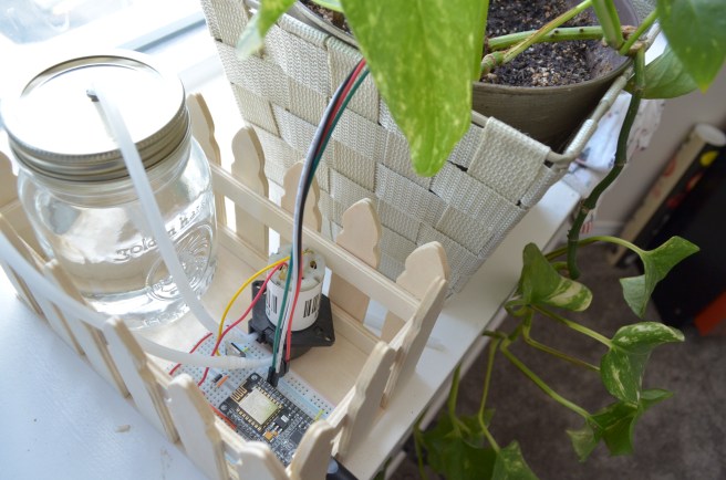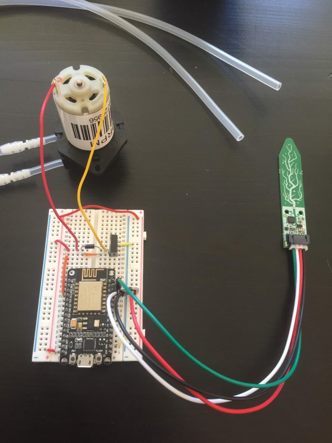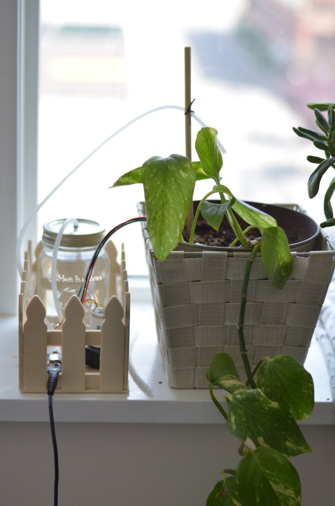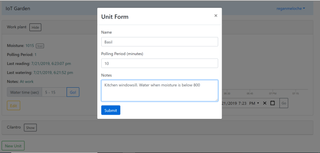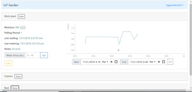 The IoT garden is a hardware project and web application that allows you to monitor the moisture of a houseplant and also water from anywhere you can get an internet connection. The hardware consists of a NodeMCU chip connected to a moisture sensor and a motorized pump. It is programmed to periodically poll the moisture sensor and send the result to a web server, which backs a web application. The user can see the moisture on the dashboard web application and make the decision to trigger the water pump for a short period of time. The user assembles the physical unit, adds it onto the dashboard, and the NodeMCU code is automatically generated. The user just has to enter some credentials in the generated file and upload it to the NodeMCU.