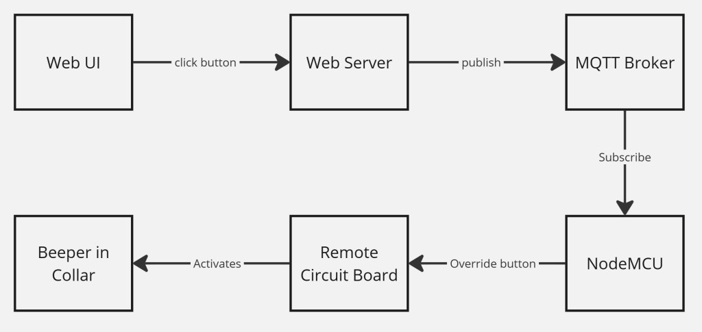 The main components include a website from which we can activate the sound and the buzz functionality, and a circuit, which is hooked up to the remote. The remote, in turn, activates the sound/buzz on the collar.