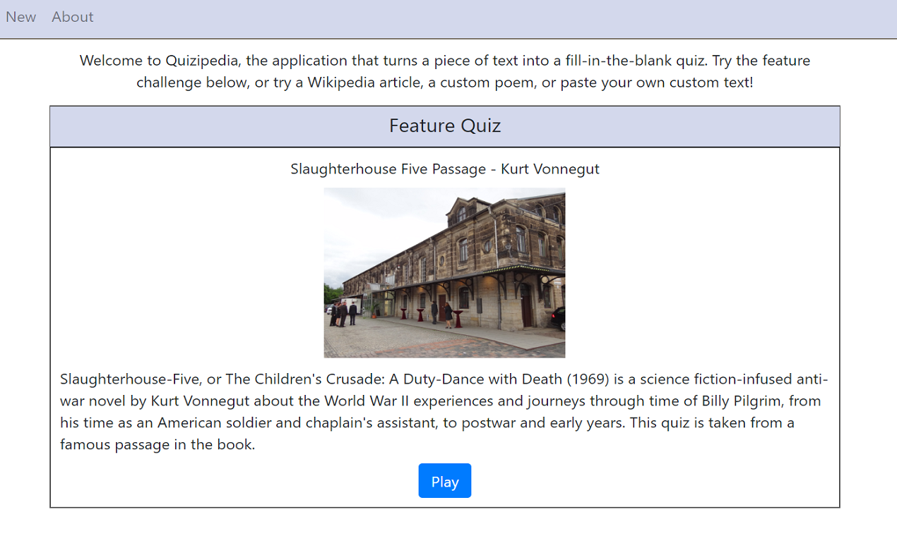 Quizipedia is a web application that takes a piece of text and turns it into a fill-in-the-bank quiz! It began as an idea for a project-based class in university. Years later I picked up the idea again and re-built it from scratch. It consists of a back-end API written in Node.js and a front-end user interface written in React.
