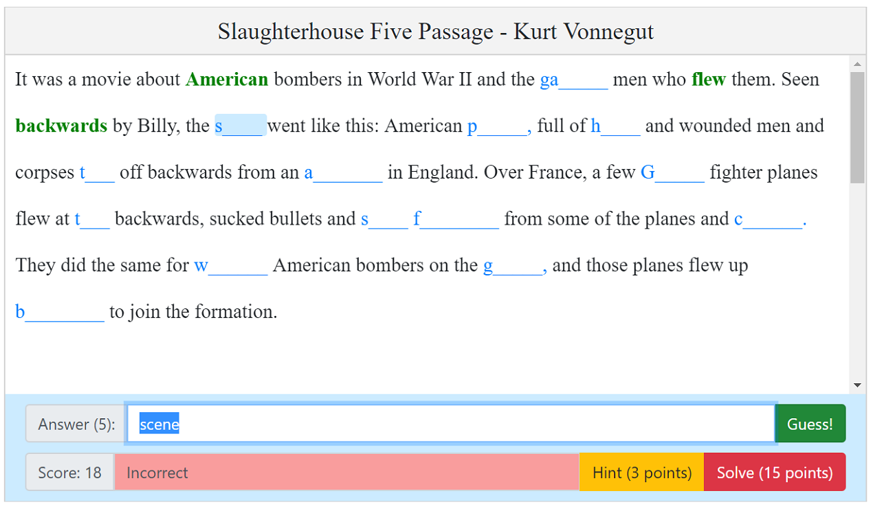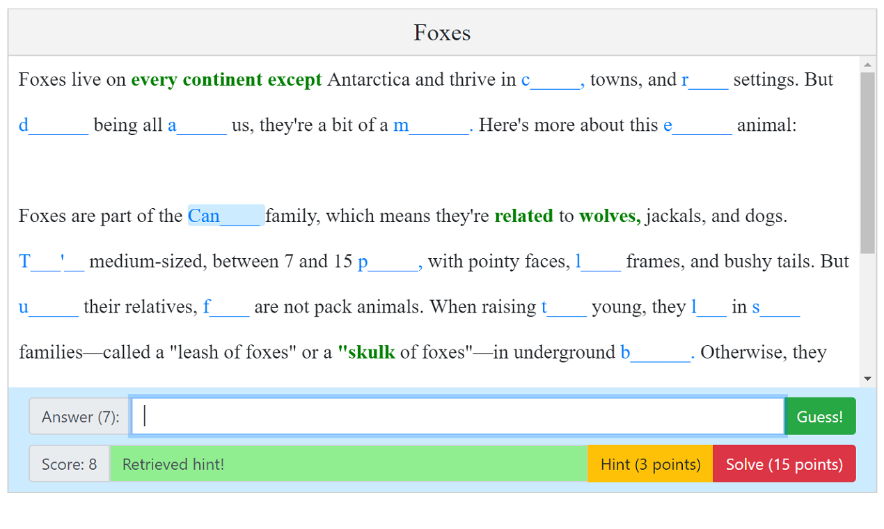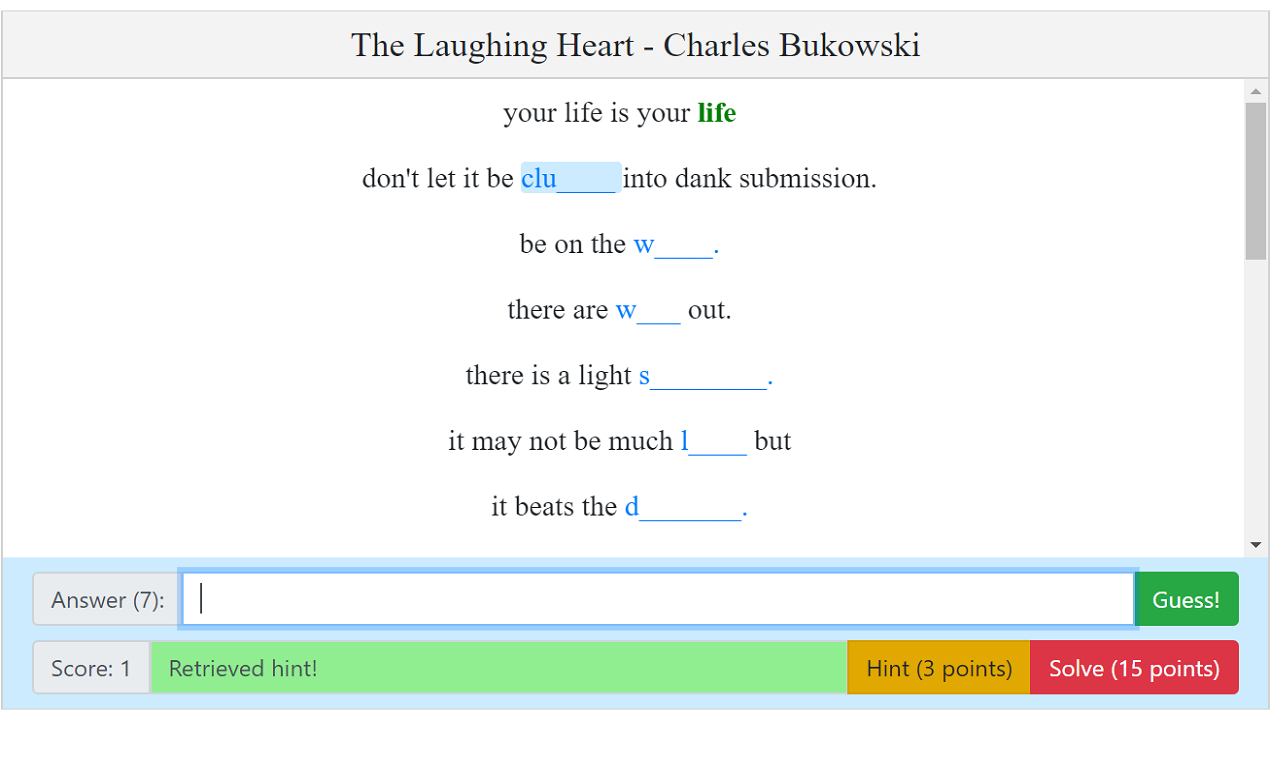 The user can enter some custom text, choose a classic poem from our library, or browse Wikipedia to select an article. The text is passed to the back-end server, where a custom algorithm sorts out which words are “relevant”. The relevant words are assigned a score and blanked out when the game is presented to the user.