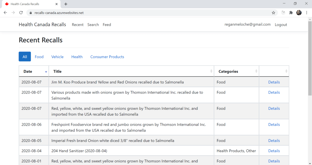 This is a full-stack web application that serves as a user interface and expansion on the Health Canada Recalls open API found here.