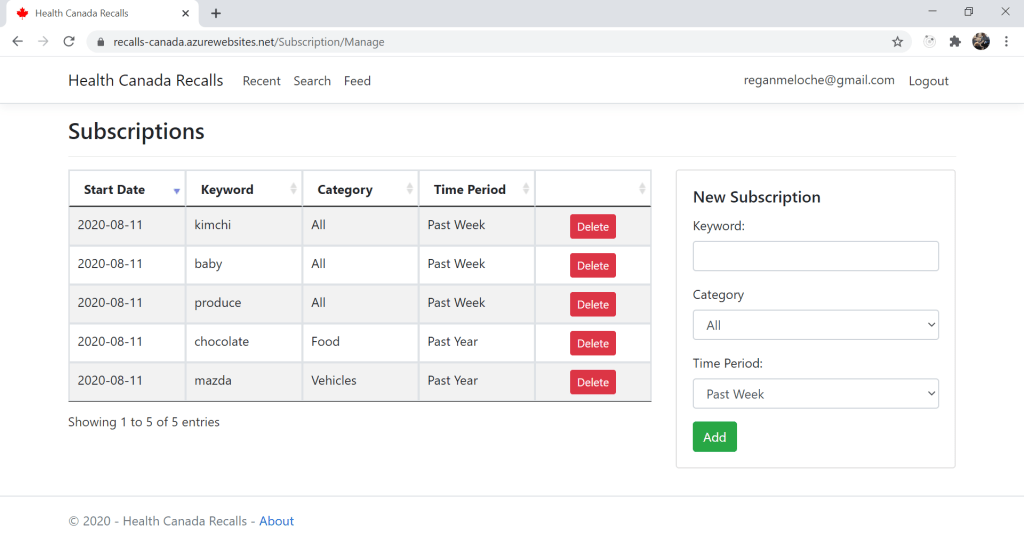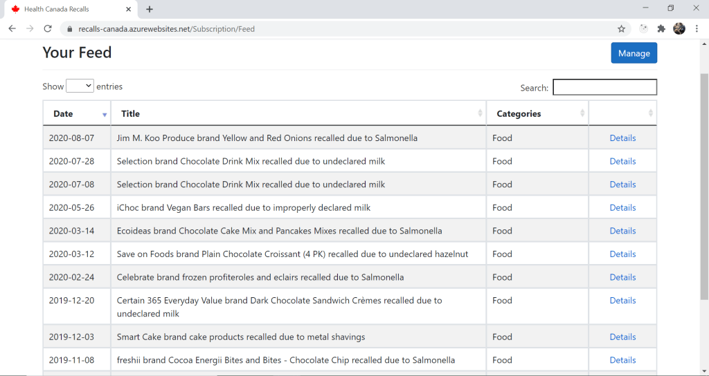 The user is able to view summaries of recent recalls in a variety of defined categories, search the api for recalls using a keyword, and view the details provided by Health Canada about a given recall. Furthermore, the user can register with the application, which allows them to add customization. They can subscribe to certain keywords, and the relevant recalls will then appear in their custom feed. Future plans include the ability to save/favourite certain recalls and also add in the option of sending an automated email each week with recalls in their feed.