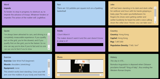 A single-page web app that combines various APIs from the web and assembles them into a simple interface. The APIs fetch data for “blanks” of the day (e.g. word of the day, quote of the day, joke of the day, etc.). The API requests are cached and set to expire at midnight, so each day has a new set of items. This is a hobby project written with .NET 6, using C# and Razor pages.